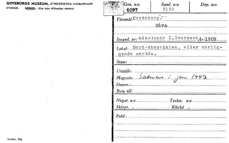 • GC/TEBORGS MUSEUM, ETNOGRAFISKA AVDELNINGEN Saml. n:o Dep. n:o ETNOGR. kW:ML. (Det icke tillämpliga strykes) 3152 Föremål:Xryddkor Gåva miss ionär I Iwar s s onAr: Insaml. av: 19.09 Lokal: Nord-Abess... Visa hela