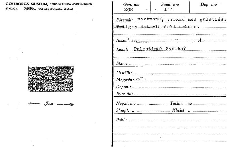 GOTEBORGS MUSEUM, ETNOGRAFISKA AVDELNINGEN ETNOGR. 1-47.(41åL. (Det icke tillämpliga strykes) Gen. n:o I Sam!. n:o Dep. n:o 208 • 144 Föremål: rortmonä.-9. virkad med guldtråd... bgt.ex1änd-9.kt_ ar...