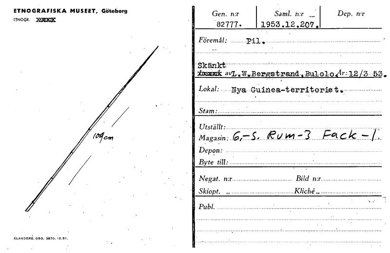 Utställt Magasin; DP139n : Byte till: .i-? Foick — ETNOGRAFISKA MUSEET, Göteborg ETNOGR. 2§2ocx ELAN0505. Gl3G. 3870. 10.51. Gen. n:r Saml. n:r ,,_,: Dep. n:r 82777. 1953.12.207, Negat. n:r  Bild n:r Skiopt.  Kliché„ Föremål:  pil Skänkt lama* avii-,W,Bergstrand.„-Bulolo,Ar:12/3 . .53. Lokal: Nya Guinea territoriet, Stam: Publ. [ocr]