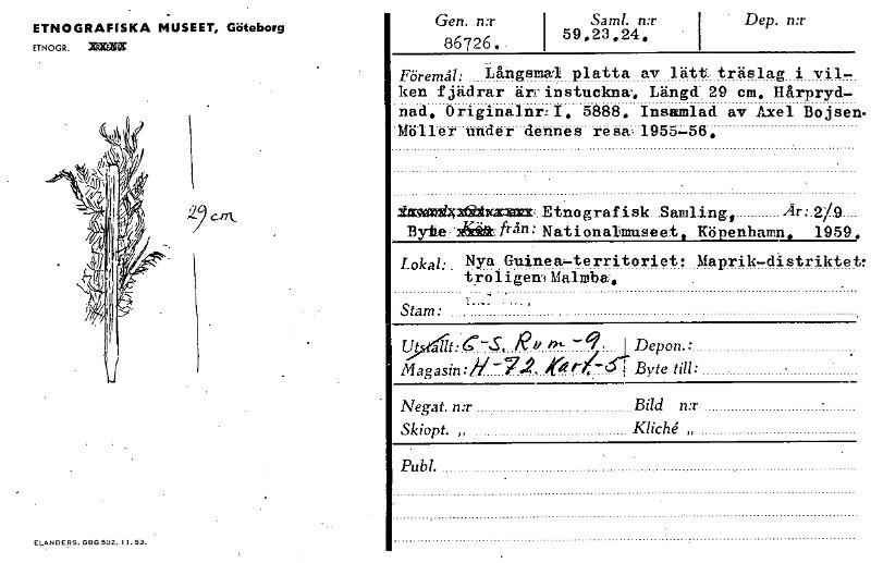 ETNOGRAFISKA MUSEET, Göteborg ETNOGR. XRXEM • ELANDEBS. GBG 502. 11. 53. Gen. n:r 86726..1 Sam!. n:r 59,23.24,, " Dep. n:r Föremål: Långsmal platta av lätt. träslag i. vil- ken fjädrar ärr instuckn...