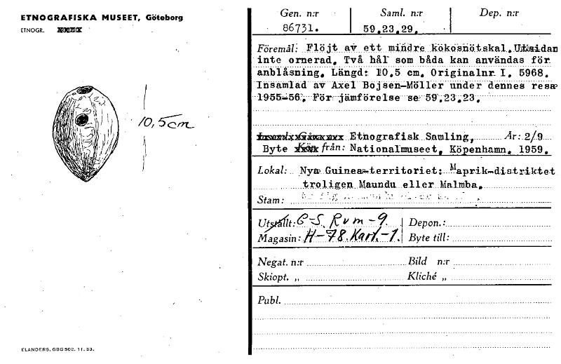 ETNOGRAFISKA MUSEET, Göteborg ETNOGR. 1«931X ELANDERS. GAG 502. 11. 53. • Gen. n:r • 86731. I Sam!. n:r I 59.23,29. • .i Dep. n:r Föremål: Flöjt av ett miiiilre •14;köötskal...TIKsida • inte ornerad,...