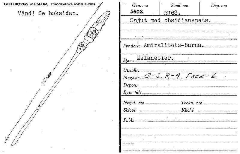 • GOTEBORGS MUSEUM, ETNOGRAFISKA AVDELNINGEN Vänd! Se baksidan.. Gen. n:o Saml. n:o Dep. n:o 5602 2763. Spjut med obsidianspets. Fyndort: . Amiralitets-öarna. StamMelanesier. • Utställt: Magasin: S. De... Visa hela