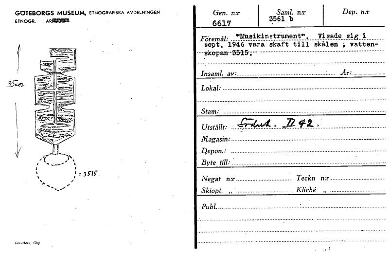 • GOTEBORGS MUSEUM, ETNOGRAFISKA AVDELNINGEN ETNOGR. ARS 3.5;4- el il i •■ • - • Elwiders, Gbg Gen. n:r 6617 Samt. n:r 3561b Dep. n:r Föremål: "Mu.sikinetrument". Visade sig i sept. 1946 vara skaft ti... Visa hela