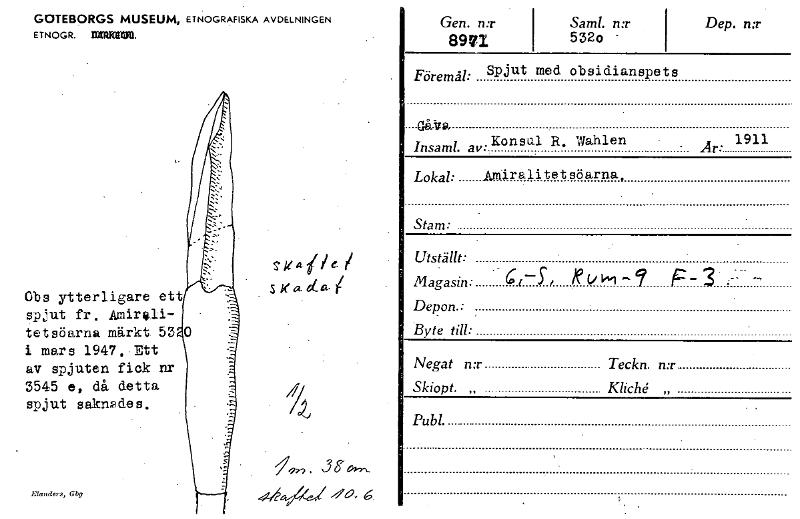 GOTEBORGS MUSEUM, ETNOGRAFISKA AVDELNINGEN E TNOGR. ~VM. Gen. n:r 8971 Samt. n:r 532o - Dep. n:r Föremål: Spjut med obsidianspets i Insaml. av: Konsul R•Wahl en Ar• 1911 Lokal: Andr a 1 i te t sö ar...