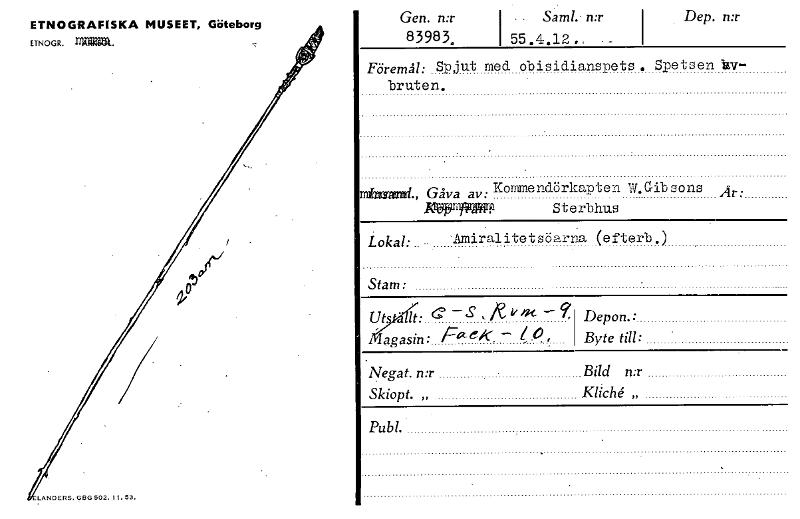 • ETNOGRAFISKA MUSEET, Göteborg ETNOGR. Metöl.. Dep. n:r Gen. n:r 83983. .. - Saml.• n:r 55.4.12 Föremål: Spjut med. ob i sidianspets . Spetsen kv- bruten. ., Gåva av: Komme ndö rir. ap t e 11 VI. Cl- ... Visa hela