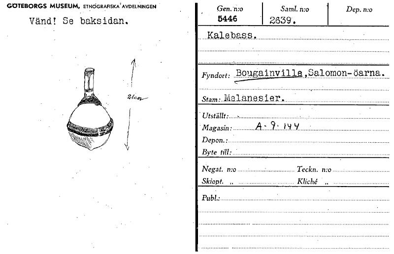 1 Dep. mo Gen.'n:o 5446 Kalebass, Sam!. 2639. GOTEBORGS MUSEUM, ETNCSGRAFISKA'AVDELNINGEN Vänd! Se baksidan. Fyrdort:,I3225512Lina,Salomon-öarna. smmalelanesler. Utställt: • Magasin: A- 9' )9,), • De...