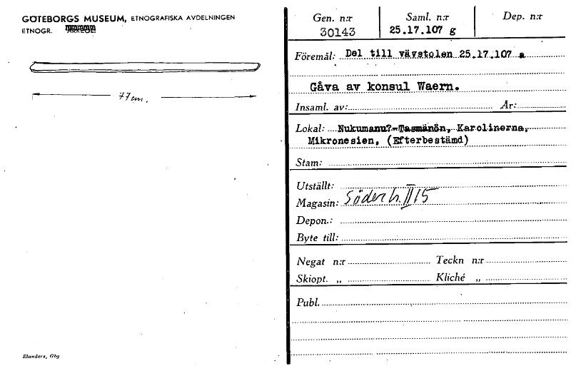 GOTEBORGS MUSEUM, ETNOGRAFISKA AVDELNINGEN ETNOGR. Elanders, 019 Gen. n:r 30143 Samt. n:r 25.17.107 g Dep. n:r Föremål: Del till väystaen..25.1.7_,_107.._a_ . , . Gåva av konsul Waern. Insaml. av: A...