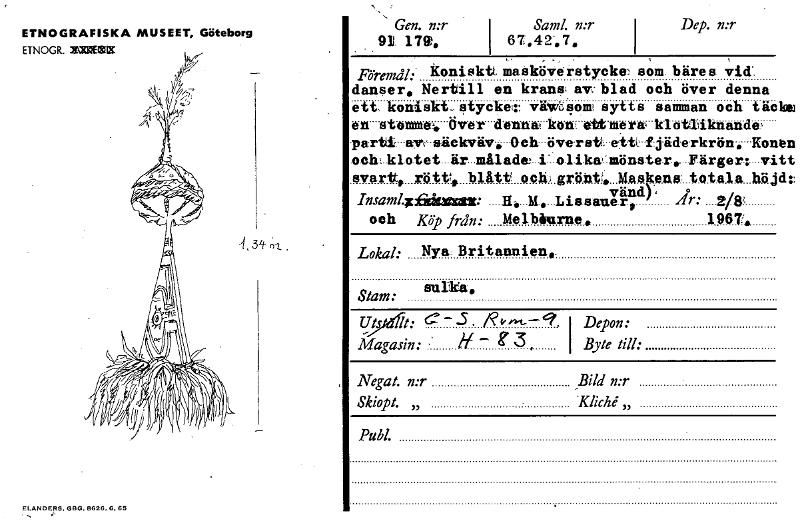 • ETNOGRAFISKA MUSEET, Göteborg ETNOGR. RUMEX k 31fr /, ■,\ / i / i i P 7 ELANDERS. GBG. 8626. 6. 65 Gen. n:r Ml 17e. Saml. n:r I 67.42.7, I Dep. n:r r • , I Föremål: koniskt, masköveretycke: som bäres... Visa hela
