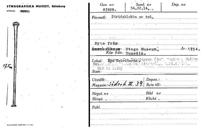 ETNOGRAFISKA MUSEET, Göteborg ETNOGR. /911ffilmi Gen. n:r 83928. • • I Saml. 54,22.14.„ Dep. n:r Föremål: Stridsklubba av trä. Byte- från intsamtlx~«: Otago Museum,. Är:1954. Köp från: Dunedin. Lokal...