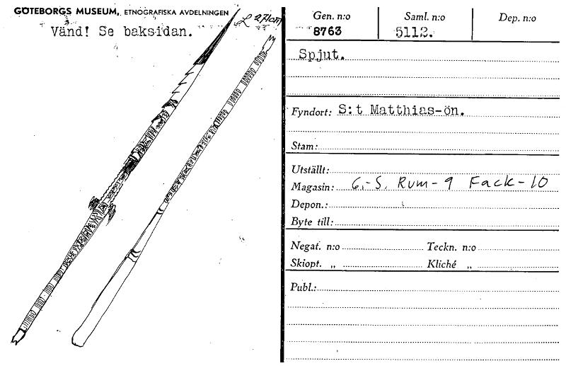 • GOTEBOROS MUSEUM,. ETNOGRAFISKA AVDELNINGEN Vänd! Se baksidan. Gen. n:o Samt. n:o Dep. n:o 8763 -5112.' ' Spjut. Fyndort: S: t Matthias-ön. Stam • Utställt Magasin: CIS, P u im - 1 F---._ c k- - G b ... Visa hela