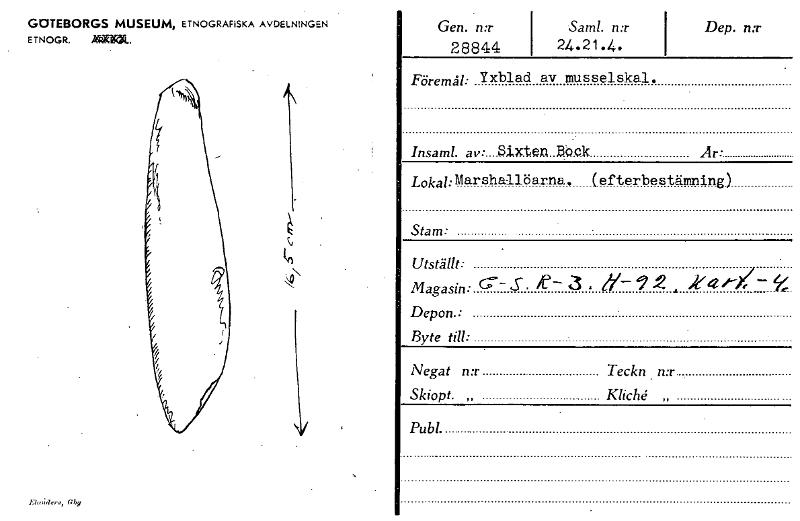 GOTEBORGS MUSEUM, ETNOGRAFISKA AVDELNINGEN ETNOGR. ~W. Elce,;der,, Ghg Gen. n:r 28844 Saml n:r 24.21.1... Dep. n:r Föremål: Yxblad av musselskal. Insaml. av: sixten B.b.c.k Är: Lokal:Marshallö e rn...