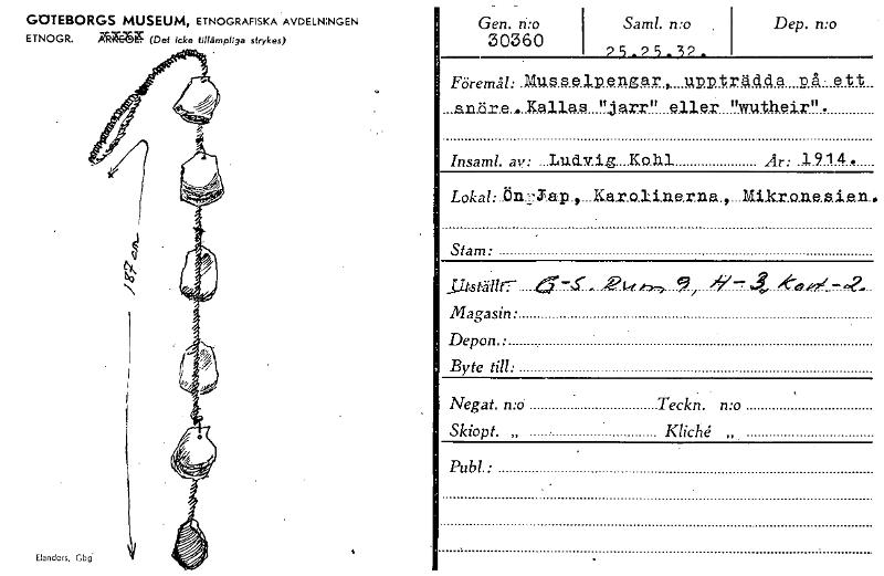 • GOTEBORGS MUSEUM, ETNOGRAFISKA AVDELNINGEN ETNOGR. Akkkgg (Det icke tillämpliga strykes) Gert. n:o 30360 Sam!. n:o , 2525.32. Dep. n:o Föremål: Musselpengar, uppträdda nå- ett ...anär.e....Kallas "j... Visa hela