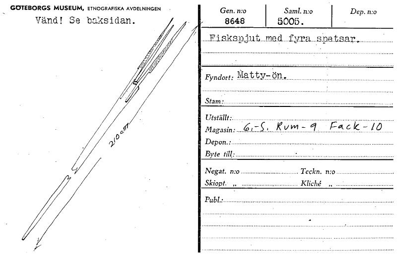 • Vänd! Se baksidan. 8648 5005. GOTEBORGS MUSEUM, ETNOGRAFISKA AVDELNINGEN . Gen. n:o Sam!. n:o Dep. n:o .... Eiskspjut med fyra spetsar. Fyndort: Mat ty- ön. Stam • Utställt: o Magasin: K V 141 — q r... Visa hela