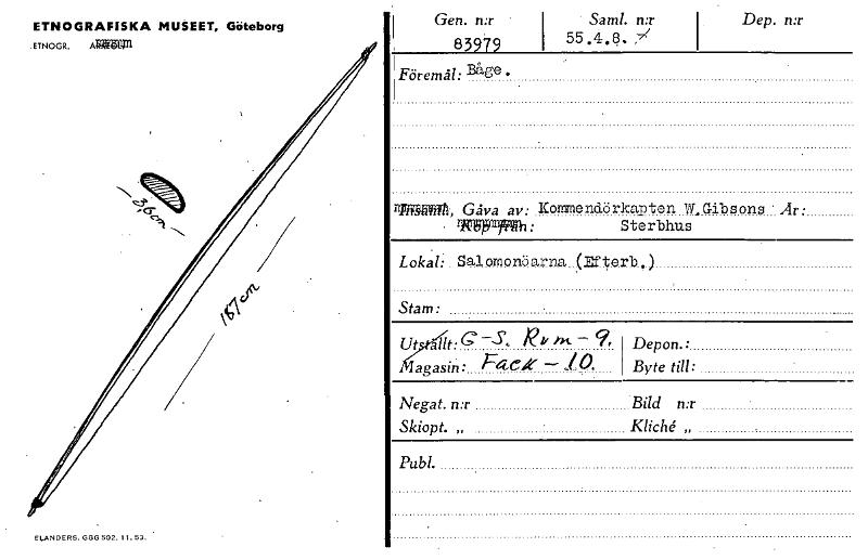 • EI,ANDERS. 000 502. 1.53. Dep. n:r Föremål: Båge. Gåva av: Kommendörkapten W.Cdbsons Är: 1~9Nh : Sterbhus Lokal: Salornonöarna (Efterb.) Stam: Ut a It:C "34-- agasin: FaCX Negat. n:r Skiopt. „ Publ.... Visa hela