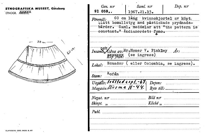 ETNOGRAFISKA MUSEET, Göteborg ETNOGR. FTRA.R9C Gen. n:r I Saml. n:r I Dep. n:r 91 059., I 1967.21.13. Föremål: 60 cm lång kvinnokjortel av köpt, slått bomullstyg med påstickade prydnads- bårder. Bana. Meddelar att "the pattern is constant." ndianordet: Lokal: Ecuador ( eller Colombia, se ingress). Stam: Kof ån Uts Magasin: ififd utrhei 1/34 '6? '6?4l• Depon: I Byte till: Negat. n:r Skiopt. „ Bild n:r Kliché,, PubL Insam åva av:Mr •Homer V. Pinkley (se ingress), Ift7W ELANDERS. GEIGA626. L 65 [ocr]