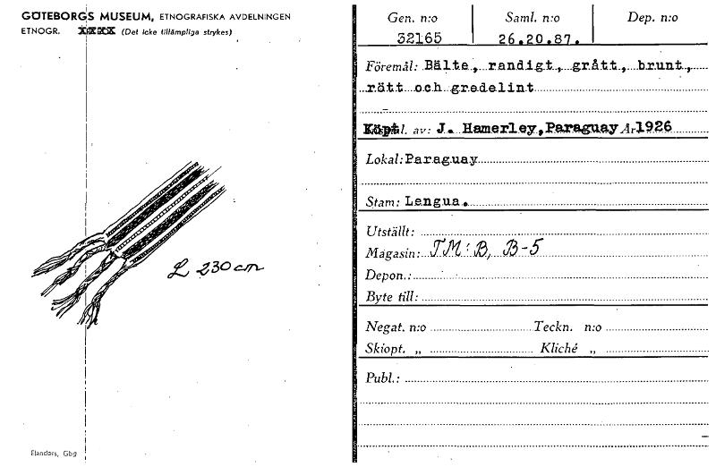 GOTEBORGS MUSEUM, ETNOGRAFISKA AVDELNINGEN ETNOGR. kix= (Det icke tillämpliga strykes) Elandgrs, Gbg Gen. n:o 32165 Saml. n:o 26 _0 8 Dep. n:o Föremål: lälte.,...r.an.d.i.g.t..,....grått.,....b.ru.n.t.., ...r.iitt....o.c.h.:gracielint rilpit /. av: J..... Hemerley , Paraguay A 4.9 26 Lokal:Par.aguay Stam: Lengua. Utställt: Magasin• (iji Depon.: ' • Byte till: Negat. n:o Teckn. n:o Skiopt. „ Kliché, „ Publ.: [ocr]