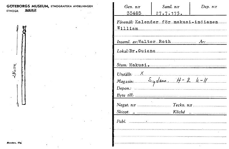 GOTEBORGS MUSEUM, ETNOGRAFISKA AVDELNINGEN ETNOGR. ZRXEdit Mandom', Gbes Gen. n:r 35485 Saml. n:r 27.7.175. Dep. n:r Föremål: Kal.end.e.r.._.för...mak.u.s.i.,i.ndianen William Insaml. av:Wa.lt.e.r...R.o.th Är: Lokal:Br...Guian.a Stam: Makusio Utställt: X Magasin: ,5 Lt ci a444 , 61 g. k - • // I Depon.: Byte till: Negat. n:r Teckn. n:r Skiopt. „ Kliché „ Publ. . [ocr]