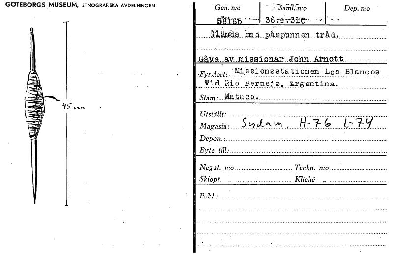 • GOTEBORGS MUSEUM, ETNOGRAFISKA AVDELNINGEN Gåva av missionAr John Arnott ,Fyndort: Missionsstationen Los Biancos Vid. Rio Bermejo, ärgentina. Gen. n:o Dep. n:o - geginnen tråd. Stam . Mataco. Utstäl... Visa hela
