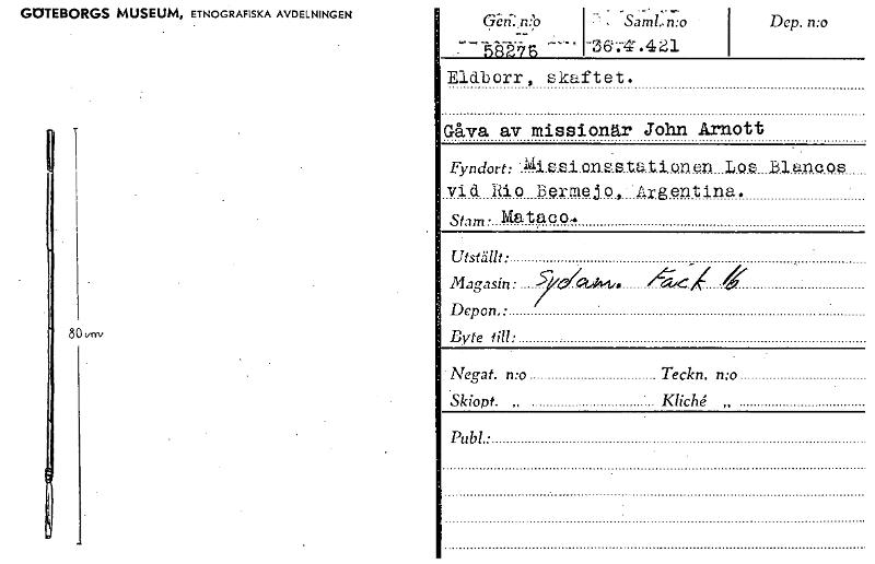 • GOTEBORGS MUSEUM, ETNOGRAFISKA AVDELNINGEN Pen.: Sarnl..n:o -3M .421 Dep. n:o Eldborr, skaftet. Gåva av missionär John årnott Fyndort: t.1 on en L.Q.C. .B1 anc os vid Rio Berrne j o 'Argentina.. st... Visa hela