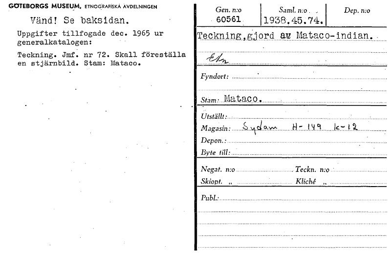 • GOTEBORGS MUSEUM, ETNOGRAFISKA AVDELNINGEN Vänd! Se baksidan. Uppgifter tillfogade dec. 1965 ur generalkatalogen: Teckning. Jmf. nr 72. Skall föreställa en stjärnbild. Stam: Mataco. Gen. n:o Saml. n:o... Visa hela