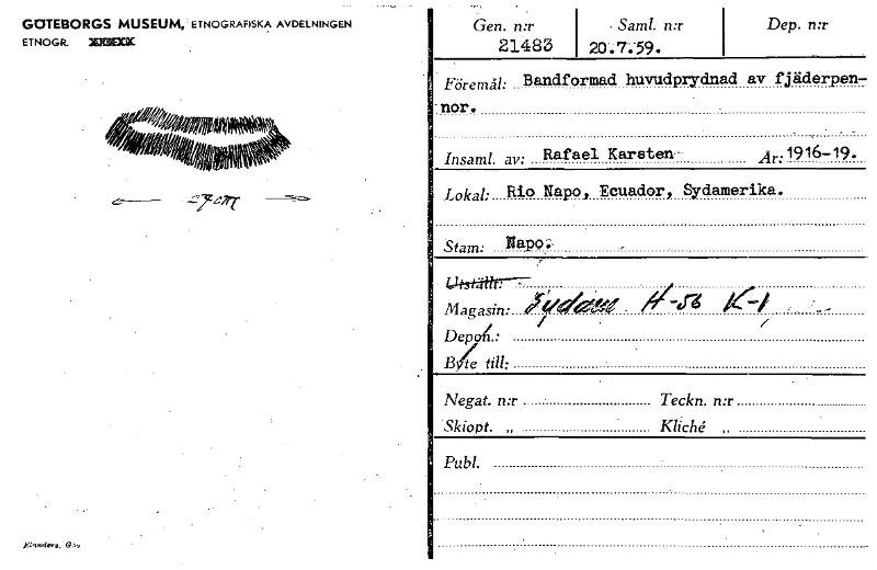 • Gen. n:r Saml. n:r Dep. n:r 21483 2a.7;39. GOTEBORGS MUSEUM, ETNOGRAFISKA AVDELNINGEN ETNOGR. 326L Ainneiers. Föremål: Bandformad huvudprydnad av fjäderpen- Insaml. av: Rafael K arsten År: 191619. -n... Visa hela