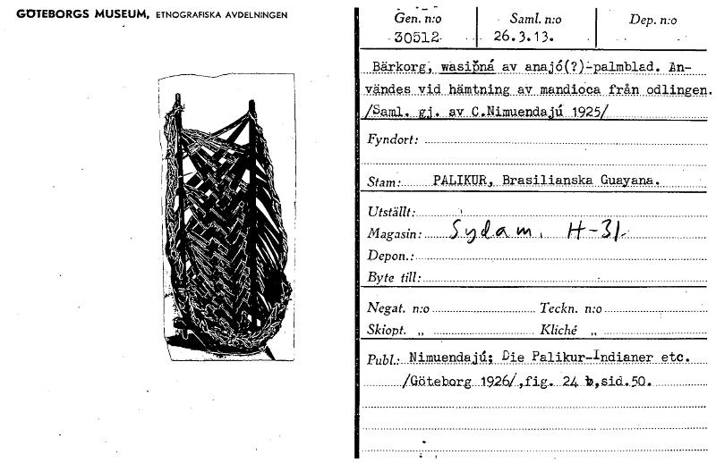 GOTEBORGS MUSEUM, ETNOGRAFISKA AVDELNINGEN _ -- en. n:o -30512- — • Sand. n:o 26.3.13. Dep. n:o Bärkorg:, wasiPnå av anal6(?)=palmblad. An- från odlingen vändes vid hämtning av mandioca Paria. gj. aV C.Nimuendajti 1925/ Fyndort: Stam • PALIKUR, Brasilianska Guayana. Utställt , Magasin: : ... 9.. .$k MM 1 peon.. Byte till: . Neg at. n:o Teckn. n:o Skiopt. , Kliché „ Publ. Nimuenda,g; Lie Palikur-Indianer etc. Mteborg_19264fig- 24 la,aid-50. [ocr]