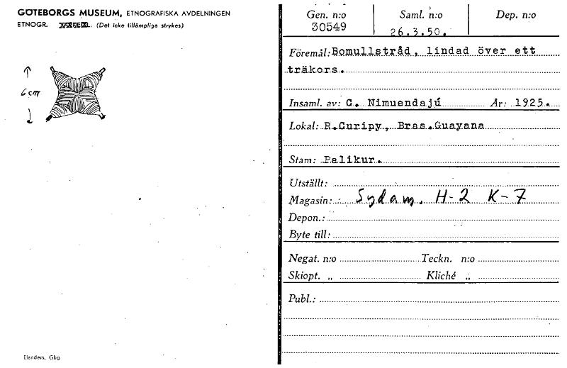 • GOTEBORGS MUSEUM, ETNOGRAFISKA AVDELNINGEN ETNOGR. DralgEML. (Det icke tillämpliga strykes) cnr Elanders, Gbg Gen. n:o 3°549 Sam!. n :o 2 6 • 3 • Dep. n:o FöremåhBomullstråd, lindad över ett ..t.r.ä.k... Visa hela