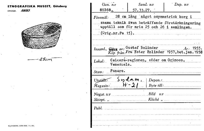 • ETNOGRAFISKA MUSEET, Göteborg ETNOGR. AXIMPC Gen. n:rSaml.• n:r I Dep. n:r 85368,, I - 57.33.27. Föremål: 28 cm lång något osymmetrisk korg i samma teknik även beträffande- förstärkningsring upptill ... Visa hela