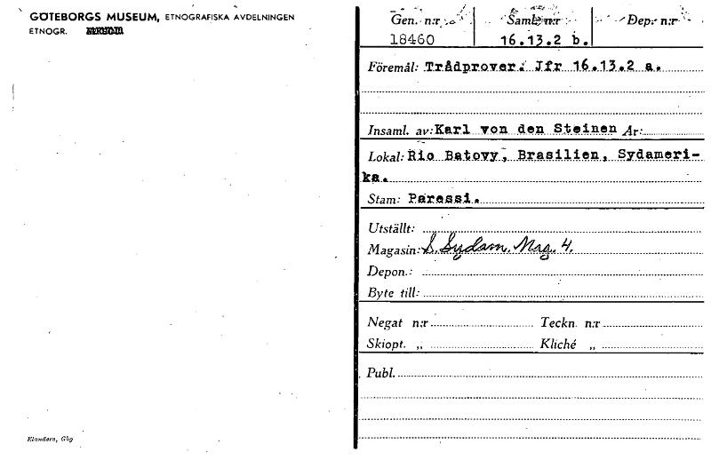 GOTEBORGS MUSEUM, ETNOGRAFISKA AVDELNINGEN ETNOGR. Em= Eltolders, Gbg ..._- Gen. • n:r ;..,....1. . 18460 16.13.2 b. - '' Sa mk,41;:r- :, Föremål: TrAciprover:: Jfr 16913.2 ao Insaml. av:Karl von den Steinen År: _._ Lokal: gi.o....B.a.t.VVY., Brasili en. , Sydameri- ka.. • Stam: P.Eireasi.• Utställt: fi . Magasin:L4,Å~ , Depon. • • Byte till: • Negat n:r Teckn. n:r. • Skiopt. ,; Kliché. „ • Publ.. [ocr]