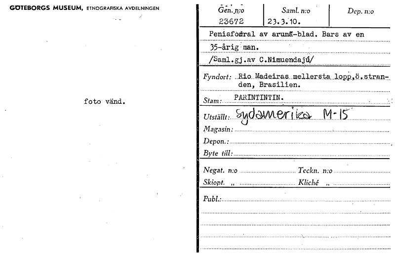 • GOTEBORGS MUSEUM, ETNOGRAFISKA AVDELNINGEN Gen..p,:o i Sam!. n:o Dep. n:o 23672 23.3.10. Penisfödral av arumä-blad. Bars av en 35-årig /Saml.gj.av C.Nimuendaje Fyndort: _Ria Madeira.s mellersta lopp... Visa hela