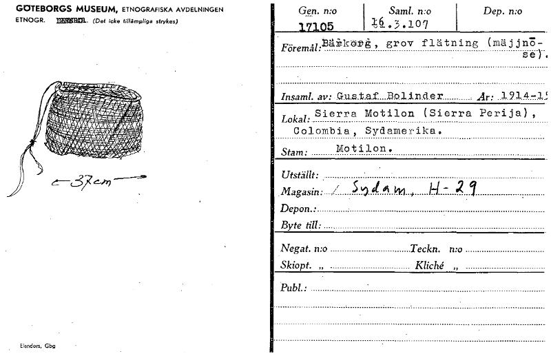 GOTEBORGS MUSEUM, ETNOGRAFISKA AVDELNINGEN ETNOGR. rffigtafin. (Det icke tillämpliga strykes) Elandars, Gbg Gen. mo 1.7105 Saml. n:o .6,-3.107 Dep. n:o Föremål:131±"'k" g, grov flätning (mä nnE- se ) . Insaml. av: -.G.u.a.t.a.r....Boliaulex - År: 1914-1' Lokal: Sierra Motilon (Sierra Pe•ija) , Colombia, Sydamerika. Stam: Motilon. Utställt: .Magasin: i .5k016 km Depon. • Byte till: Negat. n:o Teckn. n:o Skiopt. „ Kliché „ Publ.. [ocr]