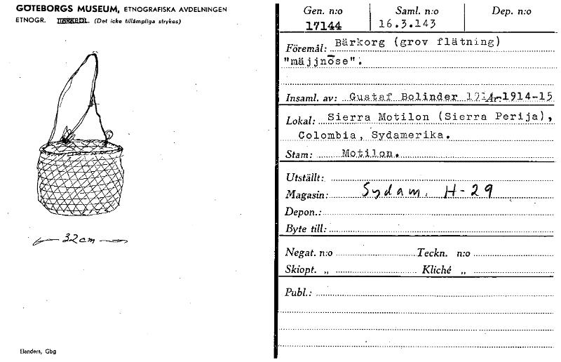 GOTEBORGS MUSEUM, ETNOGRAFISKA AVDELNINGEN E TNOGR. -074F3RIFIrft . (Det icke tillämpliga strykas) .3.-2 C- », Elanders, Gbg Gen. n:o 17144 Saml. n:o 16.3.143 Dep. n:o Föremål: Bärkorg (grov flätning) "mä j j n-ri s e " '. Insaml. av: Gustaf Bolinder 1)7A-4914-13 Lokal: Sierra Motilon (Sierra Perija) , Colombia, Sydamerika. Stam: Motia on, Utställt:. Magasin: 5,1Atn1, H 2 q Depon.: Byte till: Negat. n:o Teckn. n:o Skiopt. „ Kliché „ Publ • [ocr]