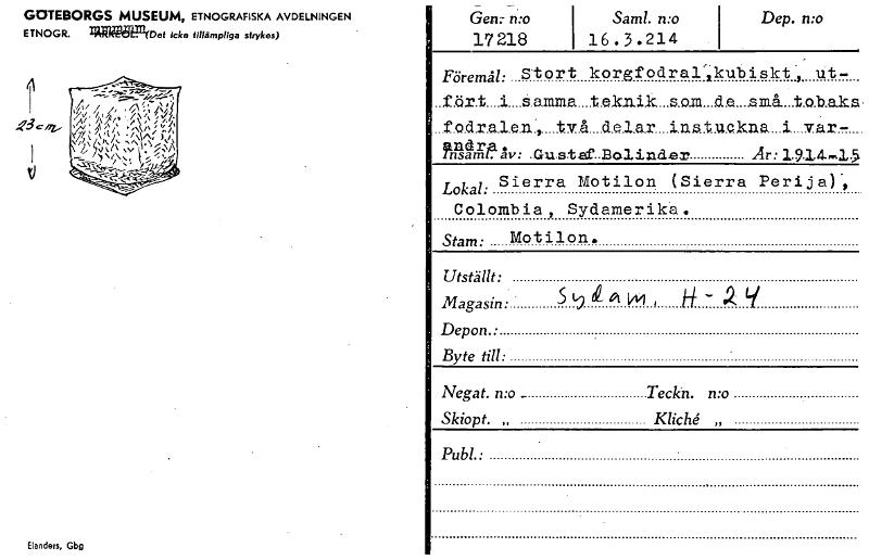 GOTEBORGS MUSEUM, ETNOGRAFISKA AVDELNINGEN ETNOGR. IRINWPADef icke tillämpliga sfrykes) Elanders, Gbg . Gen: n:o 17218 Saml. n:o 16.3.214 Dep. n:o Föremål: Stort korgfodralrIkutiskt , ut- ..f..ört....i.....å.amma....t.e.knik...s.o.m... cl C....a nå...t.o.b.aks ...f.o.d.ralen„två_cle.lar..111B.I.Aukna 1 var— finr,LsgrW Av: .Gu_stat__Bolinder Är :19.14-15 Lokal: Sierra Motilon (Sierra Perija), Colombia, Sydamerika. Stam: Motilon. Utställt: Magasin: 5 9 i at Im , H-- 2 Depon.: Byte till: Negat. n:o Teckn. n:o Skiopt. „ Kliché, „ Publ.. . el [ocr]
