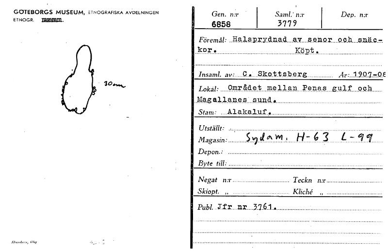 • GOTEBORGS MUSEUM, ETNOGRAFISKA AVDELNINGEN ETNOGR. ramm . Gen. n:r 6858 Sam!: n:r 3779 Dep. n:r Föremål: HalsIn'Ygngå av senor och onko,-. kor. Köpt. huamL av: Skottsberg År: 1907-0E Lokål: Områd... Visa hela