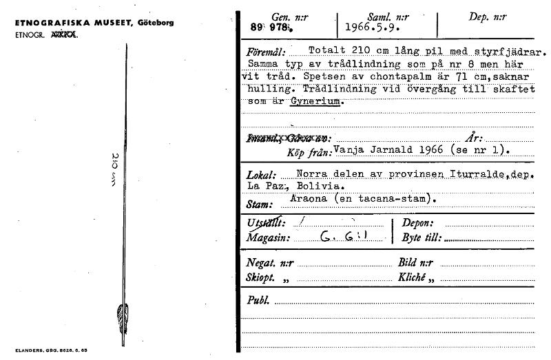 Dep. n:r ETNOGRAFISKA MUSEET, Göteborg ETNOGR. =ÖM. Gen. n:r I Sang'. n:r 89 9714 1966.5.9. Föremål: Totalt 210 cm lång pil med styrfjädrar. Samma typ av trådlindning som på nr 8 men här Vit tråd. Spetsen av chontapalm är 71 cm,saknar hulling. Trådlindning vid övergång till. skaftet -sam-är-h-nerium. torsiffutgoWitucigo: • År: Köp från:Va nja Jarnald 1966 (se nr 1). 5 Lokal: Norra delen av provinsen Iturraldeldep. La Paz:, Bolivia. Araona (en tacana-stam). Stam: Ut t: Magasin: G . G I Depon: Byte till: Negat. n:r Skiopt. „ Bild n:r Kliché,, Publ. ELANDERS. GBG. 6626. 6.66 [ocr]Stäng