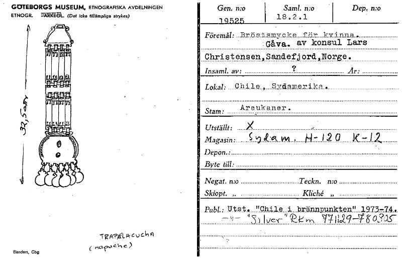 GOTEBORGS MUSEUM, ETNOGRAFISKA AVDELNINGEN ETNOGR. (Det icke tillämpliga strykas) Gen. mo 19525 1 Sam!. n:o 18.2.1 Dep. n:o Föremål: ..B.r.ö.s.t.s.nyche. .f öl- kvinna- -Gåva. av konsul Lars Christens...