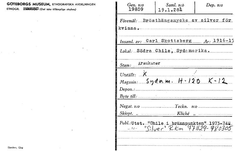 GOTEBORGS MUSEUM, ETNOGRAFISKA AVDELNINGEN ETNOGR. ramma (Det icke tillämpliga strykes) Elanders, Gbg Gen. n:o 19859 Sam!. n:ö 19.1.281 Dep. n:o Föremål: Er.ö.s.thängonyoke av silimr f'51- kvinna-. Insaml. av: Carl Skottsberg Ar: 1916-1' Lokal: ...S.ö.d.r.a....C.hile.., Sy.an mer ika . Stam: Ar aukaner r Utställt: Magasin: 5 9 ce ii;,‘,. kil , I-f - i 2b K. .... .. 11, Depon.: Byte till: Negat. n:o Teckn. n:o Skiopt. „ Kliché „ Publ.:Utst. "Chile -i_ trännpunk-ten" 197-3,74iå- l- IS%1Ve r' )64-1 17-)1029- go-305- [ocr]