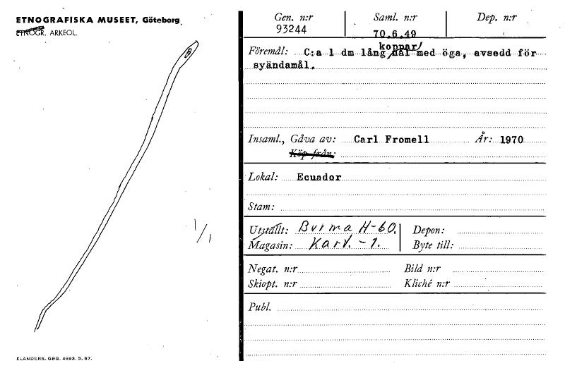 • ETNOGRAFISKA MUSEET, Göteborg. Effilera ARKEOL. ELANDERS. GI3G. 4693. 5. 67. Gen. n:r I Sam 93244 Dep. n:r L n:r 7 0 6 _49 o Föremål: C.:.a. 1 dm lång mad .ö.ga, aveedd-för syändamal, Insaml., Gåva a... Visa hela