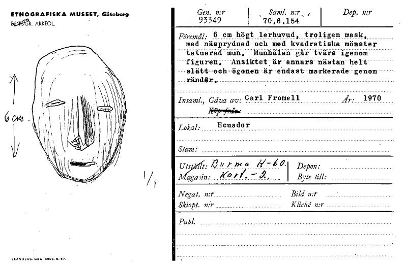 ETNOGRAFISKA MUSEET, Göteborg Ei~tR. ARKEOL. Gen. MT I Saml. MT,, i Dep. mr 93349 70.6.154 Föremål: 6 cm högt lerhuvud, troligen mask, med näsprydnad och med kvadratiska mönster tatuerad mun. Munhål...