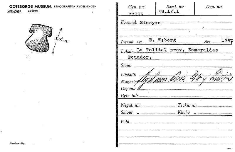 GOTEBORGS MUSEUM, ETNOGRAFISKA AVDELNINGEN xElttpAR. ARKEOL. Elanders,Cap Gen. n:r 77Z36 Saml. n:r 48.12.1 Dep.mr Föremåh.Stenyxe .. E. Wiberg Insaml. av: Ar: 199 Lokal: La Tolita5; prov. Esmeralda...