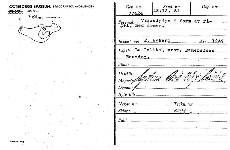 GOTEBORGS MUSEUM, ETNOGRAFISKA AVDELNINGEN ±-wistgl,. ARKEOL. L_ Elandempk Q.en. n:r 77424 Saml. n:r 48.12, 891 Dep. n:r Föreutg. Visselpipa i form av fa-' 1 ge1;med armar. 1 Insaml. av: E. Wiberg År: 19 47 Lokal: La Tolita''; _prov. Esmeraltaz Ecuador,' Stam: Utställt:. t , . c".), — Y , 2 _, c.,*/::95=-' -- Magasin.: ,...irA.,..„ Depon.• Byte till: .:),;- ,o, ■-%<3 ,,//' ;-, Negat. n:r Teckn. n:r Skiopt. „ KlicU „ ' Publ. . [ocr]
