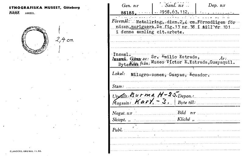 — Gen. n:r I . Saml. .n:r .. I 86185. - - - -- 1958.634112. I Dep. n:r - - , ETNOGRAFISKA MUSEET, Göteborg NW ARKEOL -2,it Förern_åk Metalitir3g7,, diam42.-,4 cm.Förmodligen för näsan", natiguerå. Se....