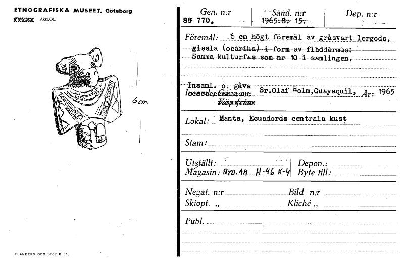 Gen. n:r 89 770, -Såna. ri:t •_ 1 19651-815v- ETNOGRAFISKA MUSEET, Göteborg lekrum ARKEOL. Dep. n:r Föremål: _6 cm högt föremål av__ gråsvart. lergoda,____ (-6C-ariiia- k fors av fladdermi*s: Samma-...