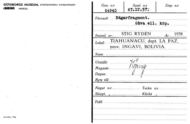 GOTEBORGS MUSEUM, ETNOGRAFISKA AVDELNINGEN damm ARKEOL. Gen. n:r 64945 Saml. n:r 43- 12: 57: Dep. n:r Föremål. Bägarfragment. Gåva.ell. köp. Insaml. av STIG RYDÉN Ar: 1938 . Lokal: TIAHUANACU, dept. LA PAZ, prov. INGAVI, BOLIVIA. Stam: Utställt; 'Vri(/ Magasin: i W,- i,‘ Depon : Il Byte till: Negat n:r Teckn n:r Skiopt. „ Kliche „ Publ. Gbg [ocr]