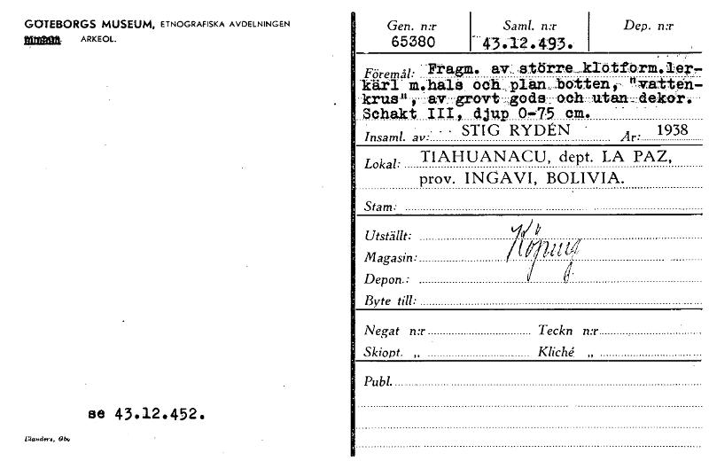GOTEBORGS MUSEUM, ETNOGRAFISKA AVDELNINGEN rig~ ARKEOL. Gen. n:r 65380 Saml. n:r 43.12.493. Dep. mr Föremål: Fragra. alt. 3.- .t.15tre_kIöt förra. ler,- kärl- m.hali3. Och..., pItunt,..lott en ,-. "vatten- --krus n , av. srovt „go de:och...utan _. dekor. Schakt III, djup 07-5 cm.- STIG RYD1N ' 1938 Insaml. av:. " ' Är: Lokal: TIAHUANACU, dept. LA PAZ, prov. INGAV', BOLIVIA. Stam: Utställt: b (np 64 Magasin: Depon.: I Byte till: Negat n:r Teckn n:r Skiopt. „ Kliche. „ Publ. se 43.12.452. i;landers, Gbr, [ocr]