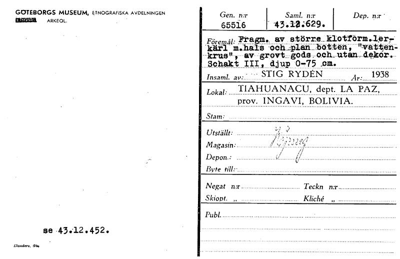 GOTEBORGS MUSEUM, ETNOGRAFISKA AVDELNINGEN 1191110211 ARKEOL. Gen. n:r 65516 Samt. n:r Dep. n:r .45.13:629. Föremål: Ptagm: av .stiörre_lk1otförmaerr- käri ra.halei 'oetuplen_botten , t!vatten- krueR , av --grovt,_,- goda-,-orell_utan.::_dekör Schakt III , djup 0-75 om. Insaml. av: STIG RYDEN Är: 1938 Lokal: TIALIVANACU, dept. LA PAZ, prov. INGAVI, BOLIVIA. Stam: ;.? Utställt: Magasin: v 4 Depon.: Byte till.• Negat n:r Teckn n:r Skio P „ Kliché „ Publ. se 43.12.452. Elandere, Gb [ocr]