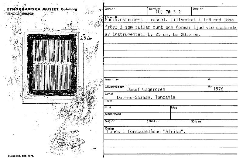 • ELANDERS. GBB. 1972. ` Gen.nr Saml.nr (U) 76.5.2 Dep.nr Pentinstrument - rassel. Tillverkat i trä med lösa fröer i som rullar runt och formar ljud vid skakande av instrumentet. L: 25 cm, B: 2O,5 cm. /... Visa hela