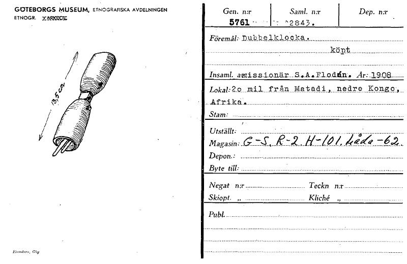GOTEBORGS MUSEUM, ETNOGRAFISKA AVDELNINGEN E TNOGR. X&R:attle. Elmoders, G bg Gen. n:r 5761 - - • Saml. n:r -7 '2843. Dep. n:r . Föremål: nubbelklocka. • . kö'n't insaml. amiss.i.o.n.ar...S....A...Fl.o.dein.. Ar:.1908 Loka/:20 MU. från Matadi, nedre Konso.., ...Afrika.. Stam: . r - ' . UtSfällt : ' Magasin: -,5' e-2, / 4,16-.z . , , Depon.: . Byte till: Ålegat n:r Teckn n:r Skiopt. „ Kliche „ PubL , . [ocr]