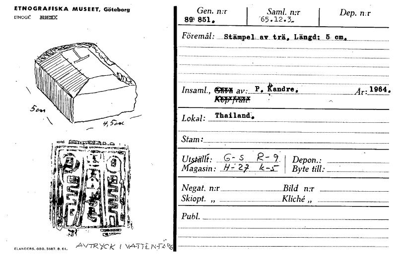 Gen. n:r Saml. n:r i Dep. n.r EMY 851. "65.12.3- Föremål: Stämpel av trä. Längd; 5 em. Insaml., Sfiff av: P, Lindra, mr3zfriff Ar:1964, Lokal: Thailand7. Stam: (1,5t411i: • G- 5 Magasin: 2 R- 9. ...