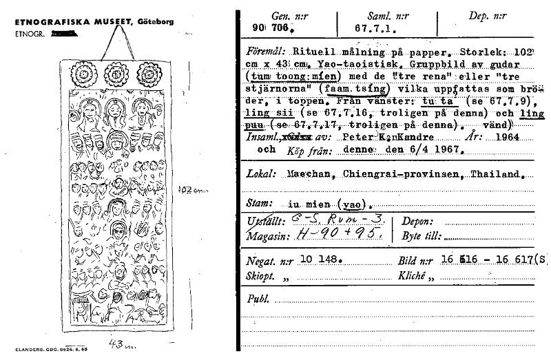 ETNOGRAFISKA MUSEET, Göteborg ETNOGR. D • -09 402 &n,,, Gen. n:r Sam'. n:r Dep. n:r 91Eb 706; i 67.7.1. I - . - . Föremål: Rituell målning på papper. Storlek: 1GT cm x 433 cmi, Yao-taoistisk. Gruppbild av gudar (tum, toong: mien med de Utre rena" :eller "tre stjärnorna" (fSam.tsin.,g) vilka upgattas som brii4 der, i toppen. Fran vanster: tu. ta" (se 67.7.9), ling sii (se 67.7-.169. troligen på denna) och ling -223±-_--(se-- -67,7.47 --- -- troligen-på denne.). 0 v-ä.iad)), insamL,xediszi av: . PeterpHInKandre Ar: 1964 och Köp från: denne-: den 6/4 1967, Lokal: Maeehan, Chiengrai-provinsen, Thailand. Stam: iu mien (ull). U ällt: de i/ -3, I Depon: Magasin: 3—i i Byte till: Negat. n:r 10 148. Bild n:r 16 616 — 16 617(5 Skiopt. „ Klich6 „ PubL 43,,„ EI.ANDERS. G0G. 6626. 6. 65 [ocr]